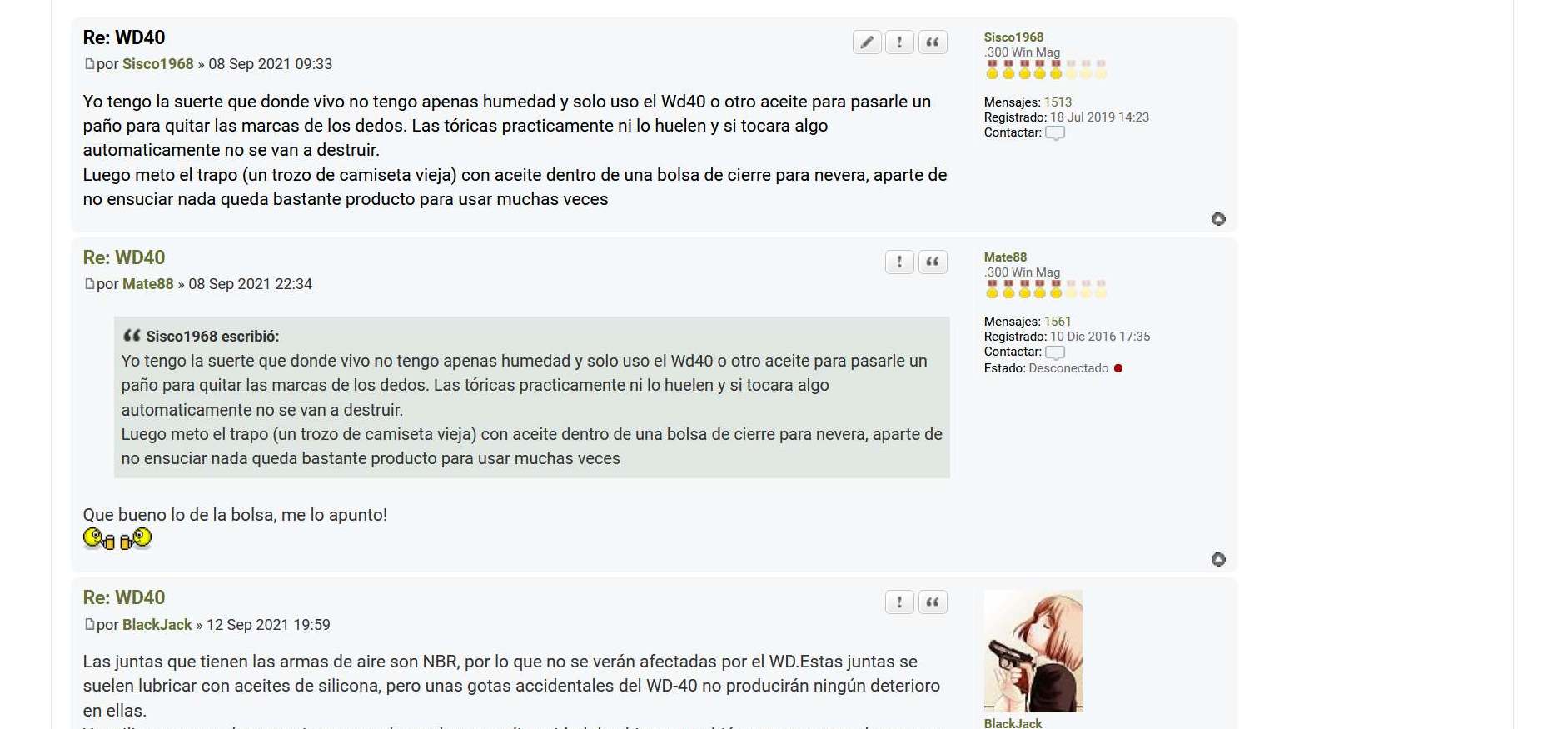 [quote="zfyjyinkkgsqxi"]Yo tengo la suerte que donde vivo no tengo apenas humedad y solo uso el Wd40 o otro aceite para pasarle un paño para quitar las marcas de los dedos. Las tóricas practicamente ni lo huelen y si tocara algo automaticamente no se van a destruir.
