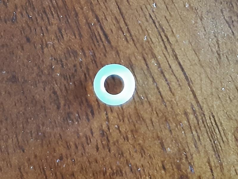 La he sacado de su alojamiento para tantearla y desde luego, no sirve una arandela de nylon. La de la pistola es casi tan blanda como el caucho, pero tiene una textura como la de la silicona solidificada. De hecho creo que el material más próximo es ese, la silicona.