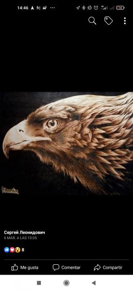 En India las esculturas se pintan en colores y para ellos es lo máximo ,en Europa pintar una escultura de mármol es blasfemia.Asi que para gustos los colores ,en nuestro casos alguna tendencia comprendida o menos comprendida.Si le parece fácil el pirograbado le invito que lo prueben.Pero comprar aparatos profesional que el de Lidl no sirven.Si hacen linias y puntos entonces vale cualquiera..Si el compañero cre que es calcar con papel carbono y quemar debe ser fácil lo invitó que lo pruebe y luego me cuenta. Una cosa más la página ,qué puse es pirograbado puro: punta incandescente y soplete nada de trucos y pinturas.Esta bien cuando uno habla de una tema que conoce no solo suposiciones. las tendencias cambiá y eso ha sido siempre asi.Si me gusta a mí o no eso poco importa y son tan válidas mi ideas como de cualquier otra persona.Voy a dejar alguna foto y no son míos para no ser tachado de irrespetuoso.Si algunos piensan que ese se obtiene con papel al carbono y copiar una imagen perdemos tiempo con esa tema.Sin un pulso firme y experiencia eso no se consiguen.