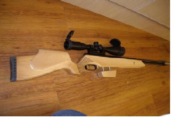 Tiene breech crosman y coasitas de esas que se compran..osea sin misterio ni mérito. Lo único cachas self-made en madera africana de no se qué pero dura de narices y acople de mira gamo atrás y punto delantero en fibra cortacesped. Es alto por el silenciador que no he puesto en las fotos.