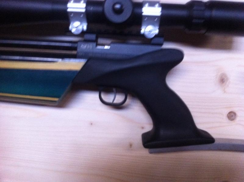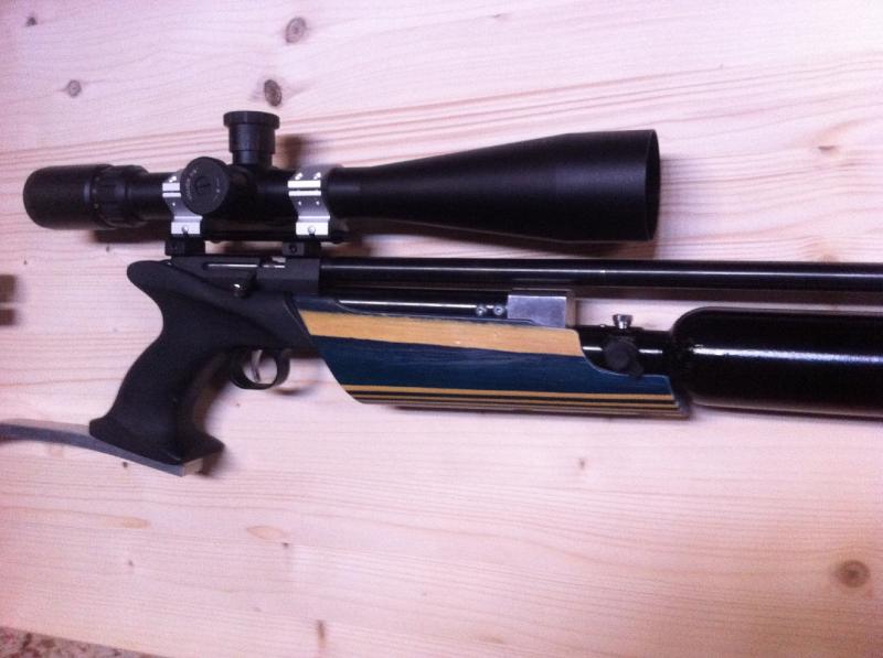 pues asi quedo la ultima crosman, cambie el deposito de 200 cc por uno de 400 cc , cambie el culatin squeleton de aluminio por una culata extensible tipo m4 con adaptador tipmman home made y asi ha quedado