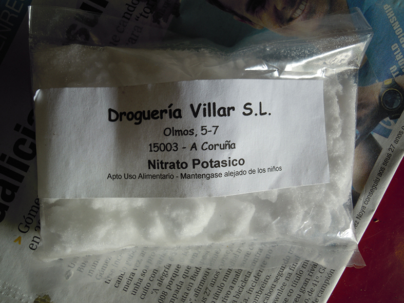 Cierto que existen productos a la venta como el "pavonsal", pero no son mas que las sales antes dichas, mezcladas ya para su uso industrial, pues cada vez, es mas difícil comprar nitratos, pues, el nitrato es el componente básico para la fabricación de explosivos, el potásico para fabricar polvora negra, y el amónico para fabricar amonal.