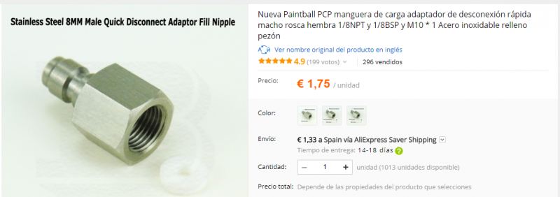Debe tener la rosca hembra de 1/8 BSP. Ahí, es donde se enrosca el pin de carga de la carabina, que es la pieza que mete el aire al deposito.