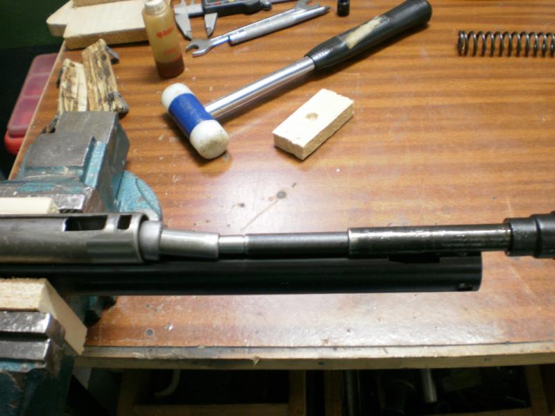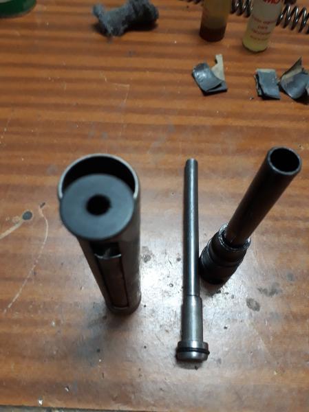 Para ser mas exactos,esta guía no entra justa justa dentro de la otra,tiene algo de juego.Lo primero que he notado ha sido que efectivamente hay algo que roza,NORMAL,es la guía deslizándose por dentro de la otra,es un poquitín pero se aprecia.A lo mejor si la hubiera hecho mas justa,hubiera sido peor a la hora de armar...porque pienso que el propio MECANISMO de origen no está diseñado ni preparado para llevar a montar el pistón RECTO hacia atrás,lo pienso así porque el propio pistón tiene unas décimas menos que la cámara y la palanca de carga lo ajusta hacia mas bien abajo.
