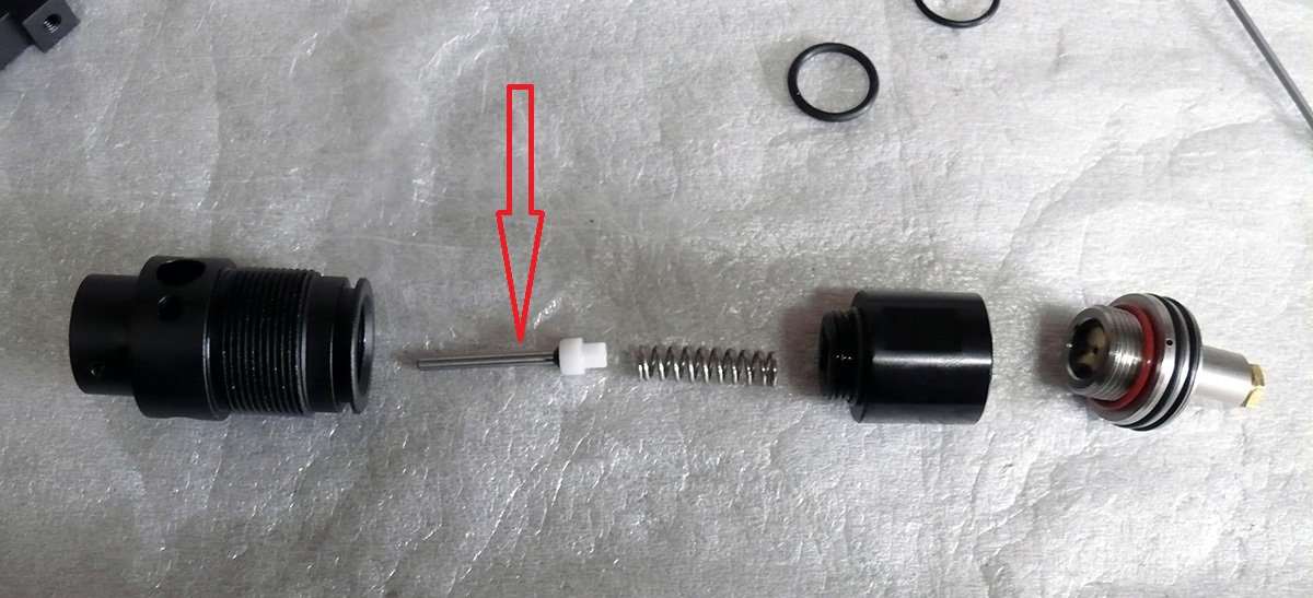 No conozco la P15, si la P12 y la P10, y supongo que serán muy parecidas, o prácticamente iguales, y tu problema, es que no cierra la válvula de disparo, y por eso sale el aire por el cañón...........es muy fácil de saber si pierde por ahí, sacando el deposito completo, sin desmontarlo, con algo de aire, y metiendolo la parte de la válvula en agua, si salen burbujas, debes cambiar la válvula, la pieza blanca de la primera foto. En la segunda foto, es por donde te va a perder aire.........