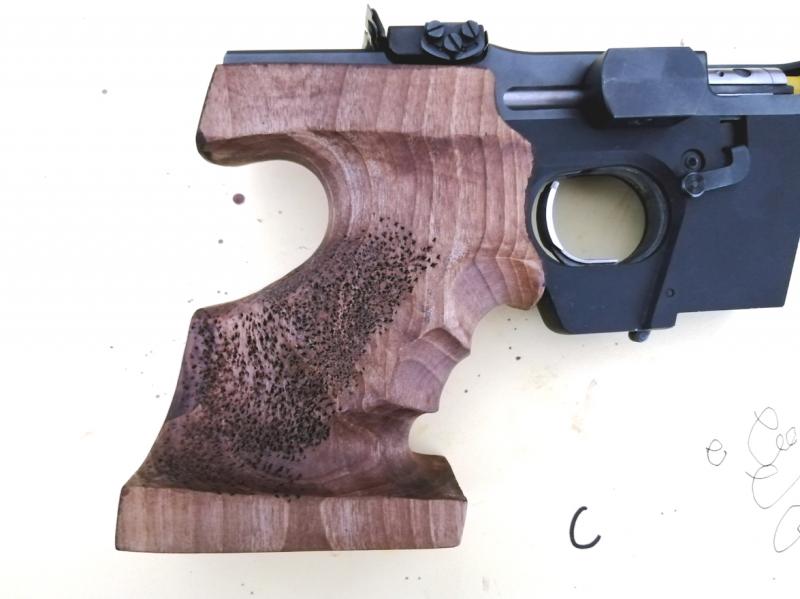 Añadir que en el último Ctº de España en Granada, pasé con la cacha nueva el control de árbitros, ángulos, medidas y caja incluida y el resultado fue sin reparo. Estoy muy contento por ello y la verdad es que en el campo de tiro va fenomenal. Para que os hagáis una idea, el punto sale alineado con el alza, en cuanto levanto el brazo y los resultados en el blanco se notan enseguida. Así es como debe ser en una cacha a medida y en cualquier arma.