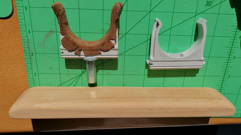 Para el soporte frontal, el apoyo sobre el guardamanos, utilizo una abrazadera para tubo de 50. La cual modifiqué, calentándola con una decapadora de calor, para dejarle rectas las puntas y cubrí con baquetilla de cuero, obtenida de un abrigo de serraje viejo y desmontado.