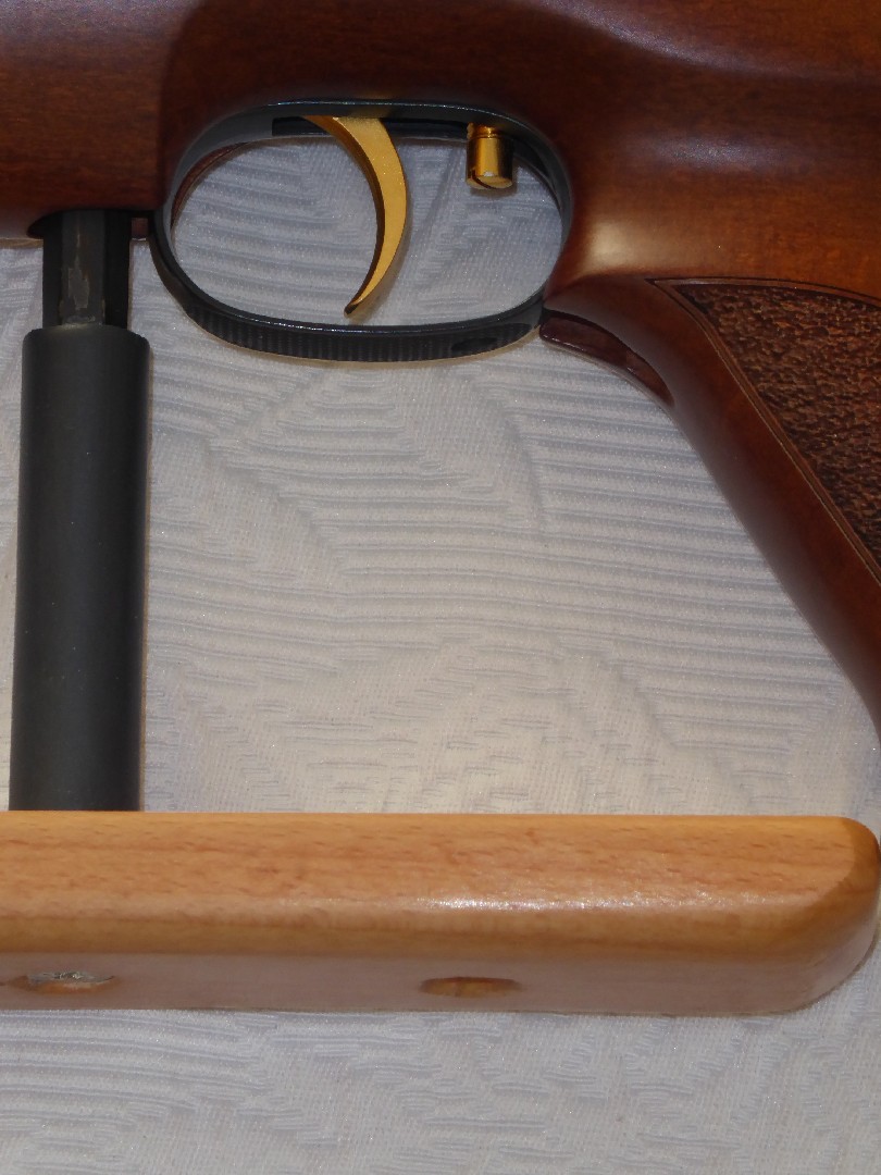 Después de intentar disparar erguido con la HW97KT, y sufrir sus 5.4Kg sobre mi brazo y cadera, decidí fabricarle una seta o palmrest en guiri, también llamado hamster.