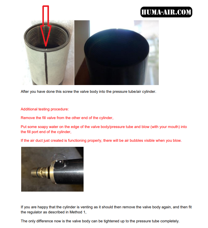 Las válvulas reguladoras de pcp que no llevan taladro, respiran por los hilos de rosca que amarran el deposito de aire a la acción de la carabina, y las propias instrucciones de instalación recomiendan dejar como 0,2 mm sin apretar el deposito contra la acción del arma, o en su caso, hacer un pequeña muesca a la rosca del cuerpo de la carabina, y un pequeño rebaje en el deposito.
