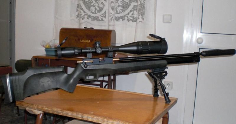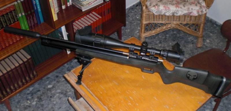 En cuanto a las modificaciones, a parte de la externas, visibles a primera vista y que incluyen; pintado en verde OD Krylon, mas camuflaje urbano y marcas "punisher", cantonera regulable, rail + bipode harrys, silenciador hw 100, visor leapers 6x 24 x 50....internamente le he cambiado el martillo por uno mas pesado, el muelle, ligero aumento del diametro del transfer...en fin...se queda a una muy buena potencia/autonomia dando unos 30 disparos buenos.