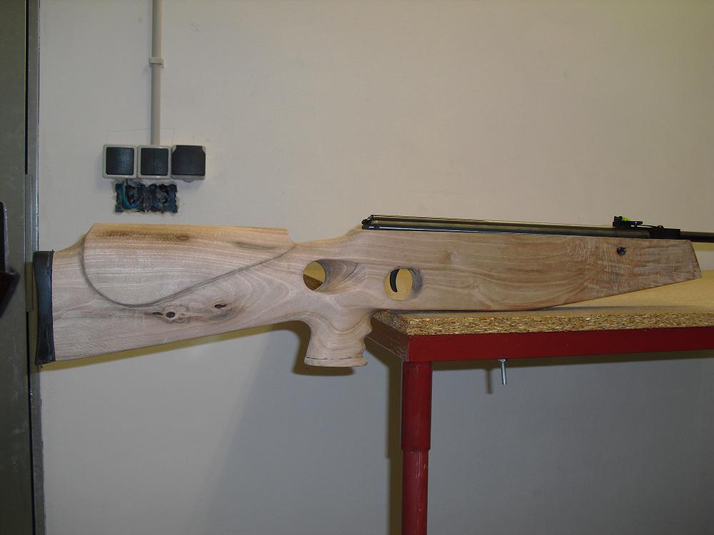 te ha quedado fantastica pero yo le aria una cosa, la parte donde pones la mano es decir delante del gatillo cortaria un trozo para usarla de seta y ademas asi le arias una linea mas estilizada, solo es una opinion