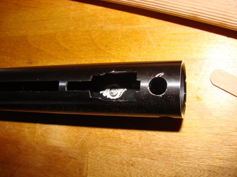lo 1º es cortar el tubo unos 5mm mas largo que el hueco que tengas en el piston luego le tube que cortar a lo largo y quitarle aprosimadamente lo que esta de negro (esta raya negra la vers al quitar el plastico) por la soldadura pues sino no me entraba en el piston luego por un estremo le cortas en forma de triangulo con la altura de lo que le hallas dado demas de largo esas puntas las doblas hacia dentro a 90 grados eso es para que cuando pongas la guia delantera del muelle (ahora no me sale el nombre es top...) sujete la camisa y con el retrocseso no se venga para atras