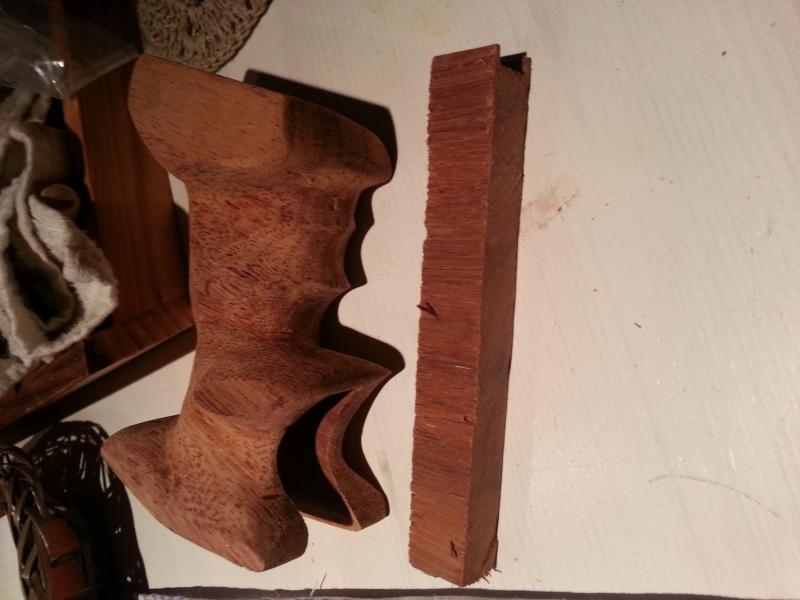 Hola a todos. Este verano me hice con una matchguns del .32. La cuestión es que soy diestro, pero mi ojo director es el izquierdo, y ademas para remate uso gafas. Como es lógico hasta la fecha he tirado con la derecha, pero claro, la postura, cuello, y sobre todo el angulo de la lente...eran un problema. Así que me dije..¿ y si tiro con la izquierda?...total no espero ser un tirador selecto. Así que me decido a preguntar y milagrosamente aparece en la armería, una cacha para zurdo, de mi talla, mas o menos. Bueno, la pruebo, sensación rara rara, y punteria pasable, pero para tirar con la izquierda no esta mal, pero lo mejor, ojo y cuello superelajado. Bueno así que decisión tomada, ahora soy zurdo en el tiro. Reconozco que me gusta el bricolaje, y me pregunto...¿ y si me hago la cachas personalizadas?....dicho y hecho, busco una tabla de madera tropical, dura y trabajable, mi gubia y mi formon. Pego tres tablitas con cola, y al día siguiente, aprovechando el sabado tarde me pongo con el tema. Y tras mucho ras ras y lija...aquí están las cachas !!!.... ¿Alguien quiere unas ??...jajajaja ¿Que os parece???
