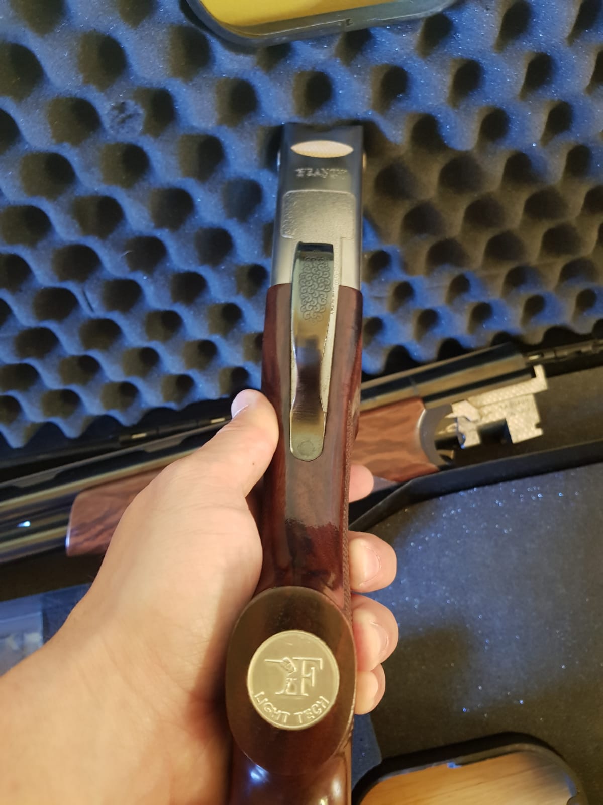 Es una Superpuesta con Cañón de 69 cm, pesa 2, 6 kg aproximadamente. Algún pequeño rasguño en la madera pero se ve bastante bien, (la parte baja de la culata esta reparada), cuando la cambie a un compañero ya estaba así, y no ha dado ningún problema, a parte tiene la cantonera cambiada por una Kick-eez sorbothane (50 euros).