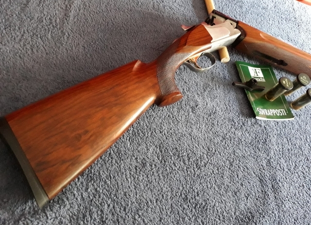 Cañón de 71 CMS, doblé punto de mira, juego de polichoques completo, maderas de luxe, culata a 36 CMS, banda ancha, selector de tiro.