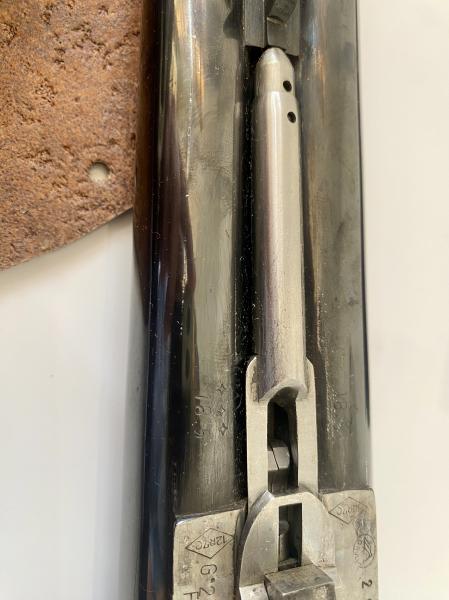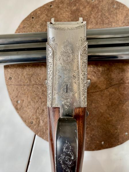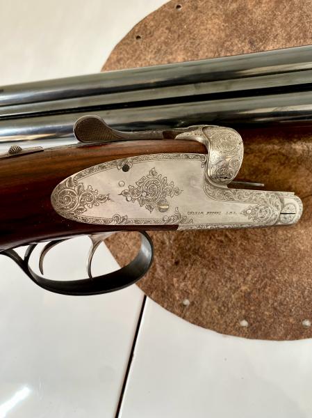 Escopeta fina GRULLA WINDSOR DE LUXE (bascula redondeada con válvula de gases y acabado blanco), cañones demiblock en calibre 12/70, de 3 y 1 estrellas, apertura automática y expulsora, doble gatillo (articulado el primero), madera de nogal