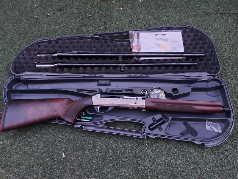 Por motivos de salud, vendo Benelli raffaello crio del calibre 20, 20/76, cañón propio longitud 65cm con banda de fibra de carbono, 15.8, más cañón adicional supersport con ported original Benelli,15.8, también 20/76 con 71cm de longitud, 2 juegos de 5 chokes, cortos y largos, intercambiables entre los dos cañones, los largos apenas usados, la culata está realizada por Batano en nogal turco para otra benelli, con gran pistolet, la original tenia una pistola muy pequeña como todas las standard, la salida y ventaja inmejorable, admite cuñas que también están incluidas, documentación, ect..
