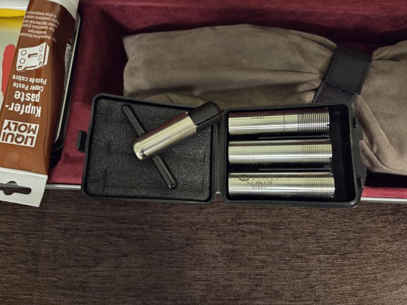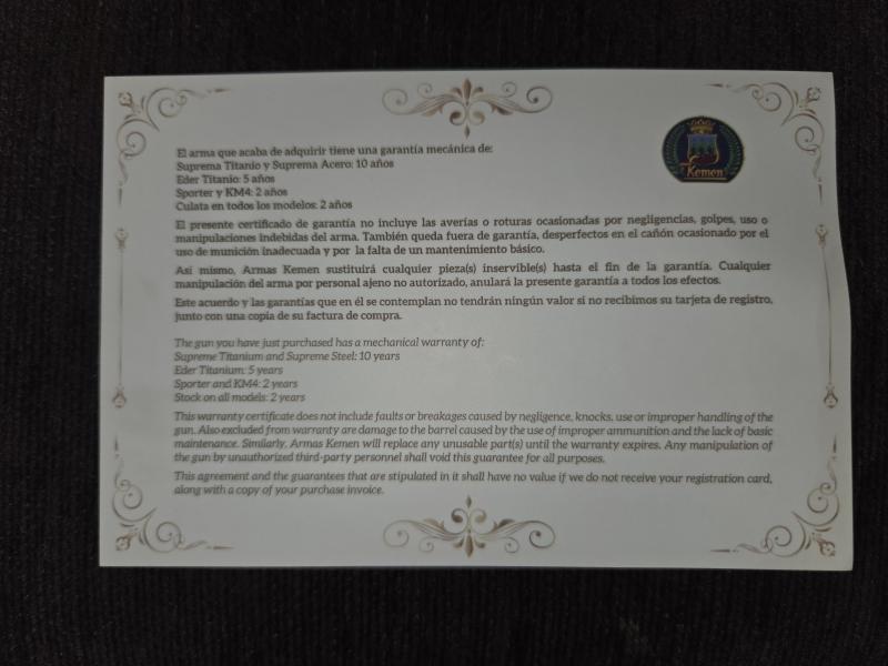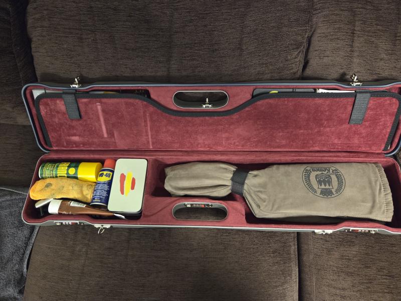 Kemen T4 fabricada y estrenada en 2021, con documentación. 4 cajones disparados. 5 chokes Briley con rosca en ambos cañones (que miden 74 cm, recámaras de 18,4 y 18,5), culata de nogal Gr 3 con lomo regulable Kemen y longitud 36,5 cm. Batería extraíble. Estuche de piezas de recambio, fundas y maletín compacto. 7750€. La Rioja. No cambios.