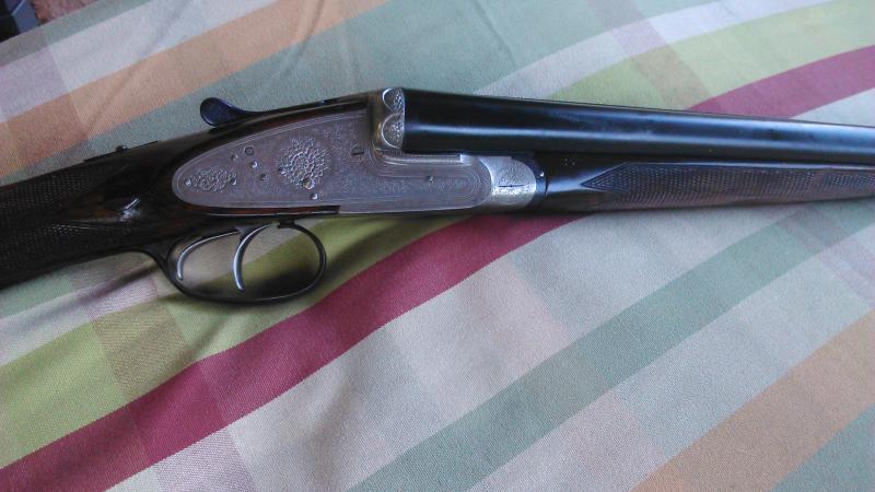 Escopeta Danokbat fina cal. 12, paralela, expulsora, pletina entera, con grabados finos y en perfecto estado y ajuste. Funda de cuero original incluida.