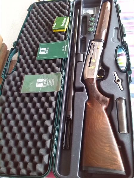 Pongo a la venta una escopeta semiautomática en calibre 20 marca Franchi 620, casi sin uso comprada de capricho, funciona perfectamente y va con su maletín, polichochs, etc. tiene una pequeña marca en la parte superior de la ventana de expulsión, no es gran cosa,se puede ver en las fotos, maderas con bonito veteado y grabados en oro.