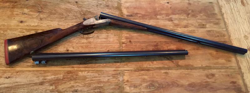 Fabricada circa 1898-1899 fue la número 2 de una pareja de escopetas de tiro, que a lo largo de su longeva vida se separaron... no he sido capaz de encontrar a su gemela. Esto, como sabéis los amantes de las paralelas finas, le quita mucho valor al precio estratosférico que podría valer la pareja (lo digo para ahorrarnos la posible negociación). La escopeta, originariamente recamarada a 65mm -como todas las armas de la época-, ha sido modificada y puede disparar cartuchería moderna de 70mm.