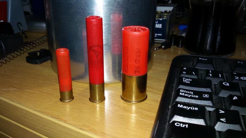 Te pongo tambien un par de fotos, en una puedes ver el cartucho de 9mm al lado de otros mas conocidos, el 410 (12mm magnum), y un cartucho del 12 normal.