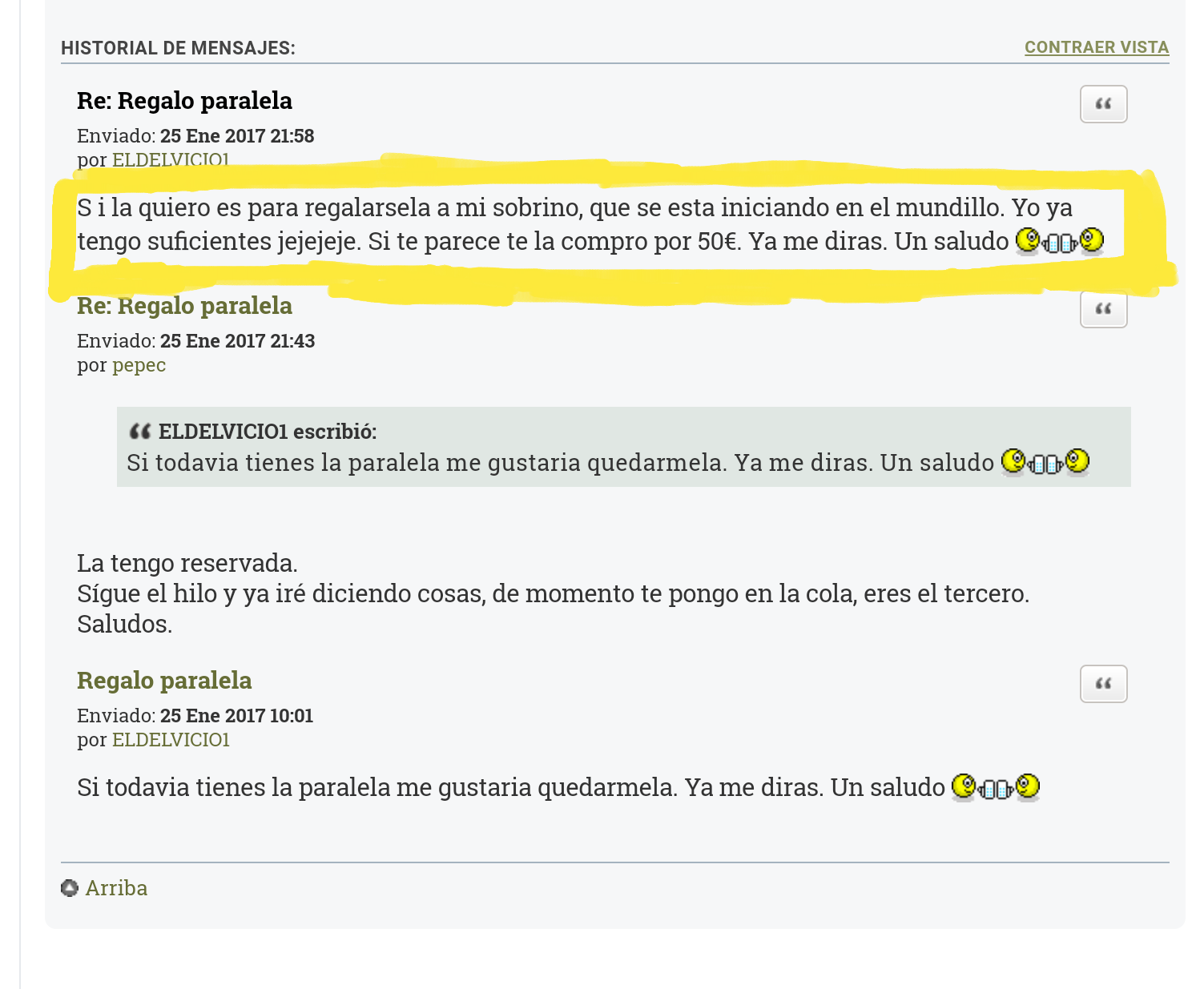 Eldelvicio01 puede que le quieras regalar a tu sobrino una escopeta me parece perfecto pero ofrecer dinero a una persona que está haciendo un regalo... está muy feo yo también me acabo de iniciar y por temas personales no puedo comprarme una escopeta de caza. Si te llega aceptar los 50€ me jodiste la ilusión, menos mal que es un tío serio y honrado y a respetado tanto el orden de los que la hemos pedido y tu oferta. Así que nada muchas gracias a pepec ya le e dado mi palabra que si un día no la quiero se la devolveré y si no tiene sitio se la regalare a otra persona...