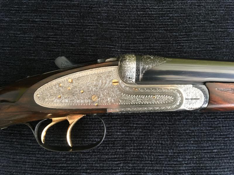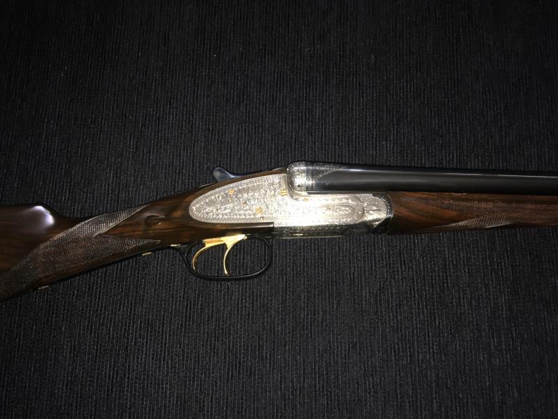 Se vende escopeta paralela del calibre 16 marca Muguruza; la escopeta fue restaurada hace años, equipándose con maderas de mayor grado que las originales. Desde entonces se encuentra expuesta en una vitrina sin utilizarse. Tiene lágrimas y dorados, es expulsora y tiene chokes de 3* * * y 1*. El maletín de las fotos no va incluido (porque ya no lo tengo), se entrega en el maletín de aluminio de la imagen. En la culata tiene una placa con las iniciales AB. Muy buen estado.
