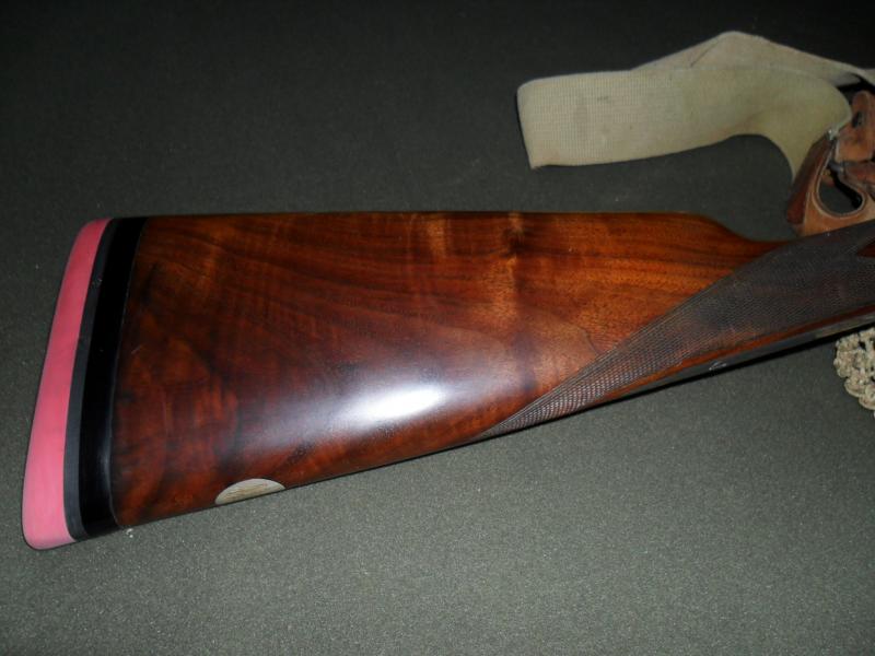 Los toques que la distinguen de las demás son su culata inglesa de precioso nogal, rematada con elegante cantonera roja tipo "Holland" que la deja a 37,5 cm de longitud. Además dispone de una placa para iniciales.