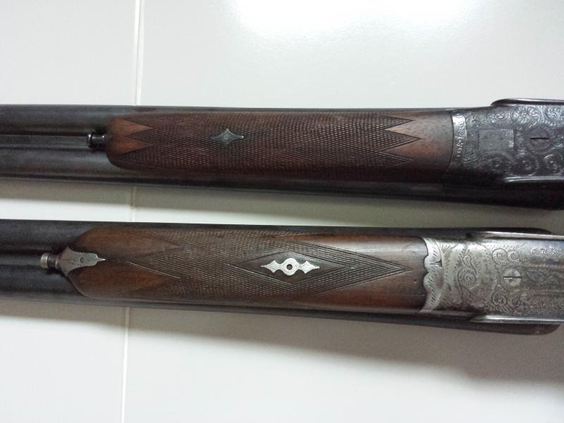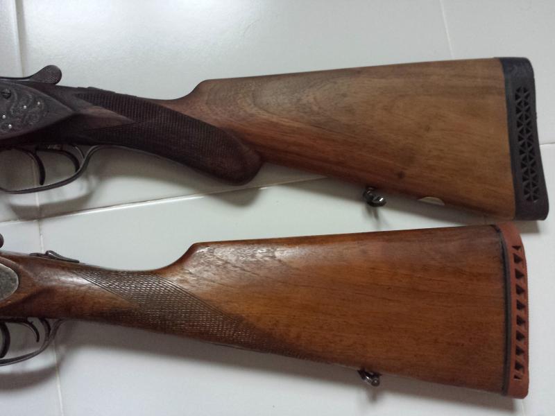 Buenas tardes , un buen amigo se retira de la caza y me ha pedido que le ponga a la venta sus 2 paralelas ,las escopetas son una faisán(la más oscura en las fotos) ,preciosa , muy bien conservada pese a su edad (fechada por el bope en 1928 , marcaje ''B'') pletina larga , extractora ,chokes de * y ** estrellas , cañones en buen estado , con cantonera de goma , mejor ver fotos y la otra es una Lig fechada en 1967 (M1) , tambien pletina larga ,expulsora ,chokes de * y *** estrellas ,cañones en buen estado y con mas uso que la faisán pese a ser bastantes años mas nueva ,tiene marcas de uso pero perfectamente funcional, si alguien quiere saber un dato en particular o foto específica sin problemas que me lo diga ,ahora lo más importante , los precios: