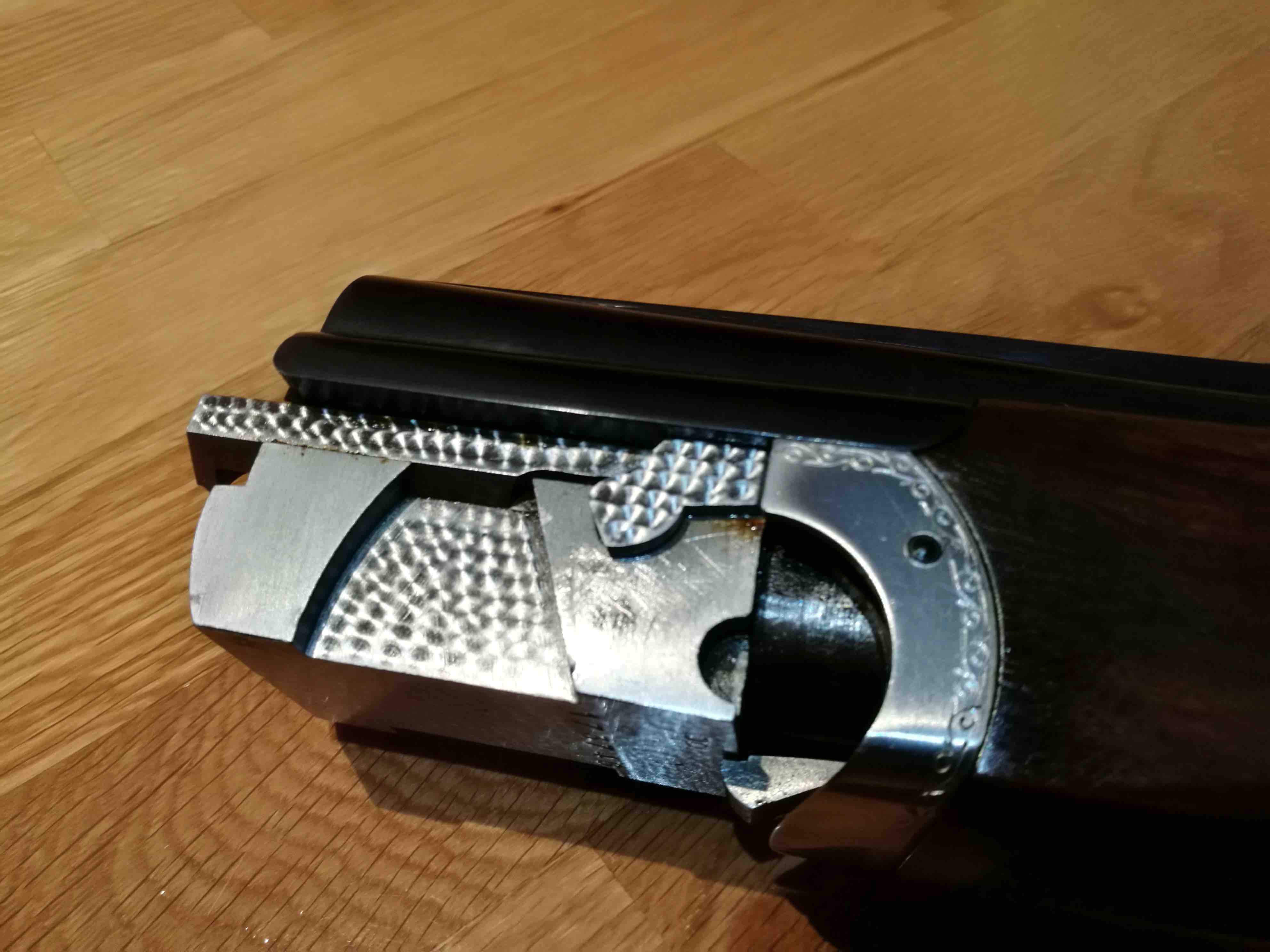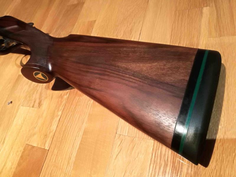 La escopeta está en un estado excepcional con un cierre tipo Boss (como las Perazzi) que todavía cuesta operar de lo poco usada que está la escopeta (conserva incluso la pegatina con el logo Aramberri en el pistolete). Las maderas están terminadas al aceite y el pavonado es el original, totalmente impoluto.