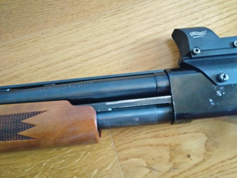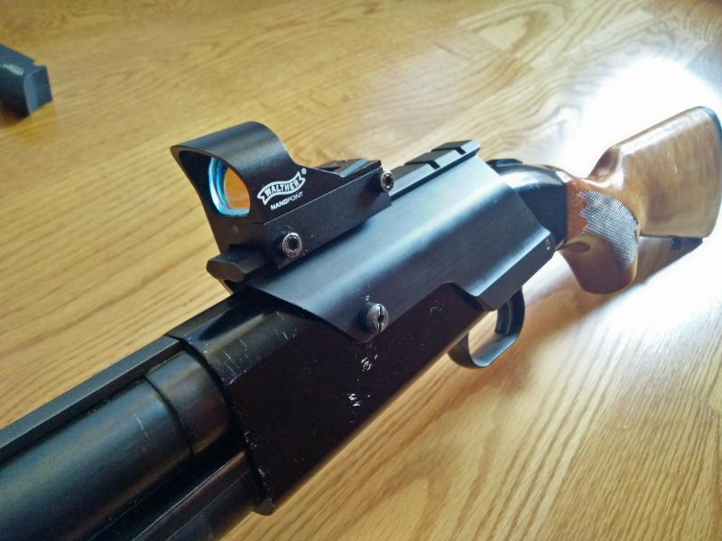 Incluye un cañón liso con polichoke y otro estriado para tirar con bala. También incluyo un punto rojo Walther NanoPoint y el carril picatinny en el que va montado.
