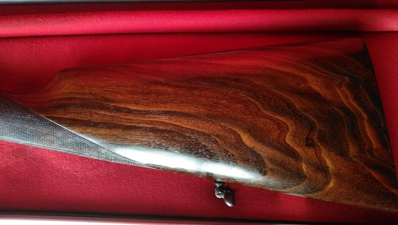 Espectaculares maderas seleccionadas que han sido restauradas y terminadas al aceite de raíz roja. La culata se encuentra original sin cortar. Con escudo dorado de familia Arrizabalaga en el guardamanos.