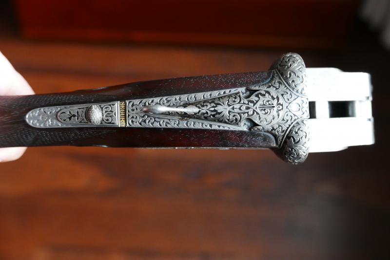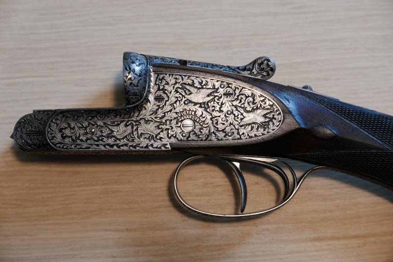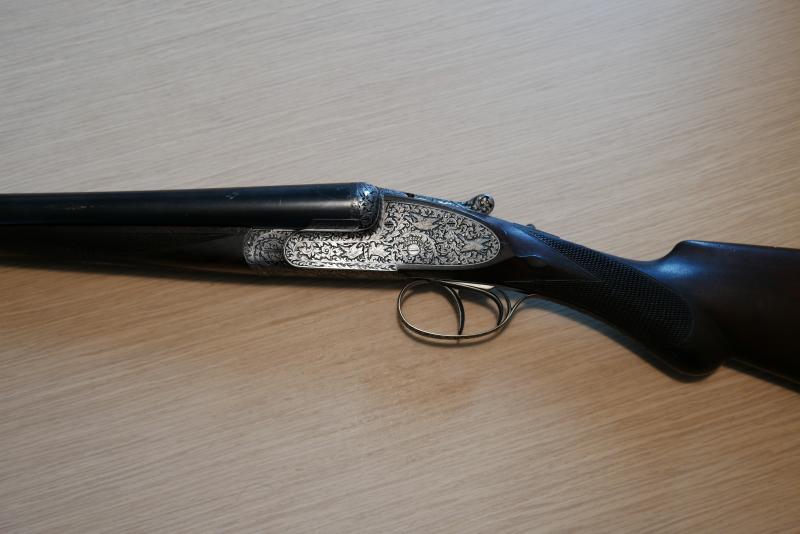 Procedente de un familiar fallecido hace más de 50 años, he recibido una escopeta bastante bien cuidada, calibre 12, expulsora, fabricada en el año 1927 (a tenor de la letra "A" grabada en los cañones), con preciosos grabados.