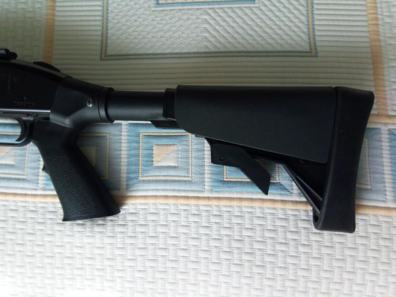 Lleva un pasamanos Hogue de material antideslizante, comprado a parte,una culata Hogue, que se puede acortar quitando cantonera,y otra culata táctica ATI con mejora de carrillera de Kydex.