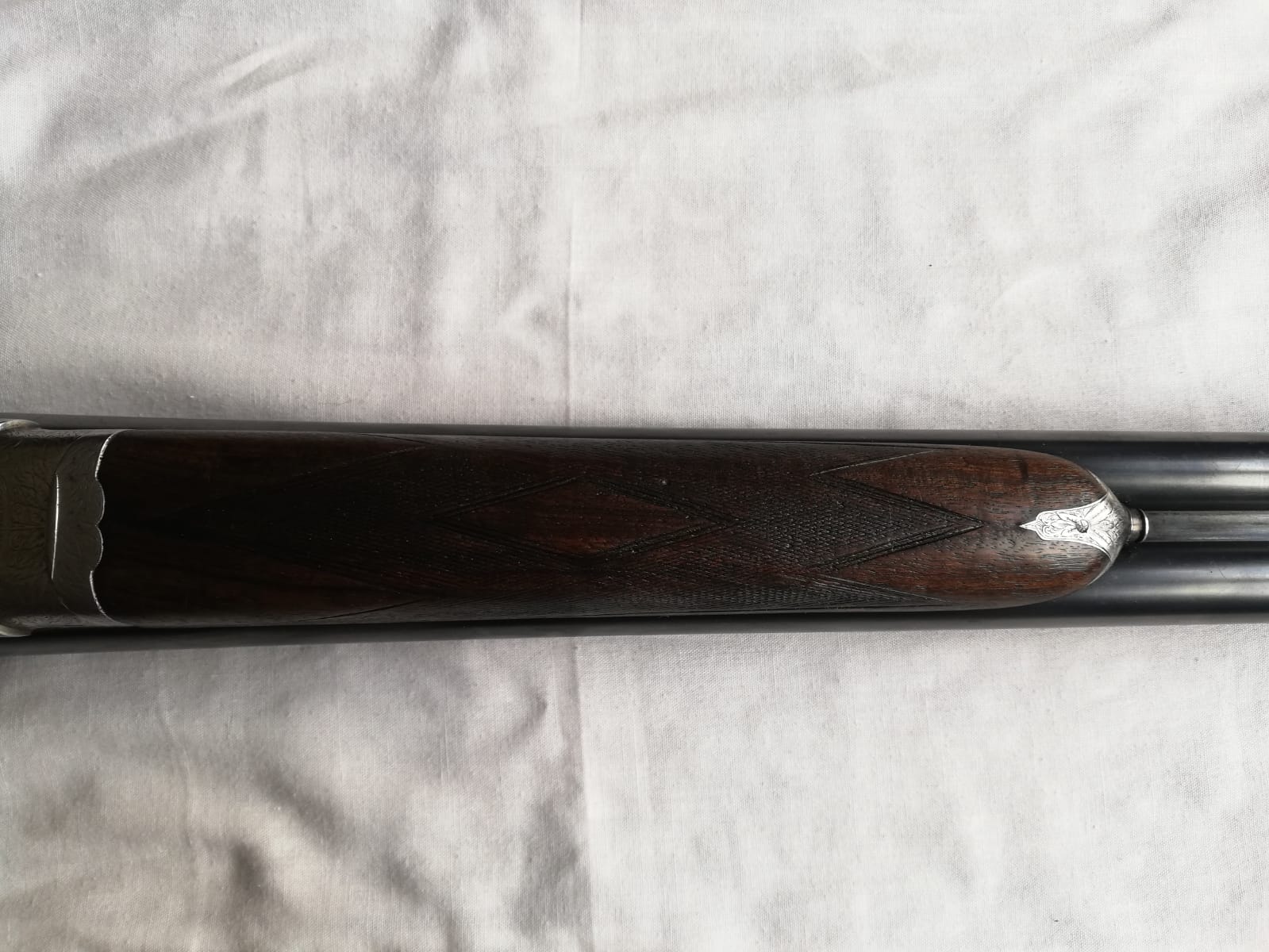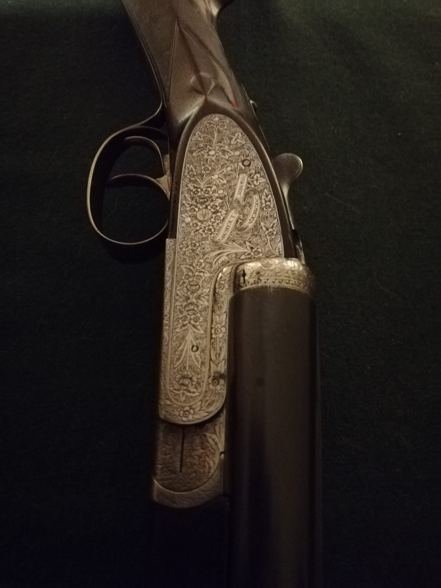 Vendo Grulla-Unión Armera del año 1945 letra Ñ modelo 215 del calibre 12/70 ánima 18.5, longitud 71cm de cañón, 7 y 8 décimas, filete de refuerzo en la báscula, labio en el guardamonte, doble gatillo articulado, válvula de escape de gases, culata inglesa, madera de nogal escogido, expulsores automáticos triple cierre purdey, pletinas desmontables a mano, mecanismo bañado en oro, acero bruñido exquisitamente grabada