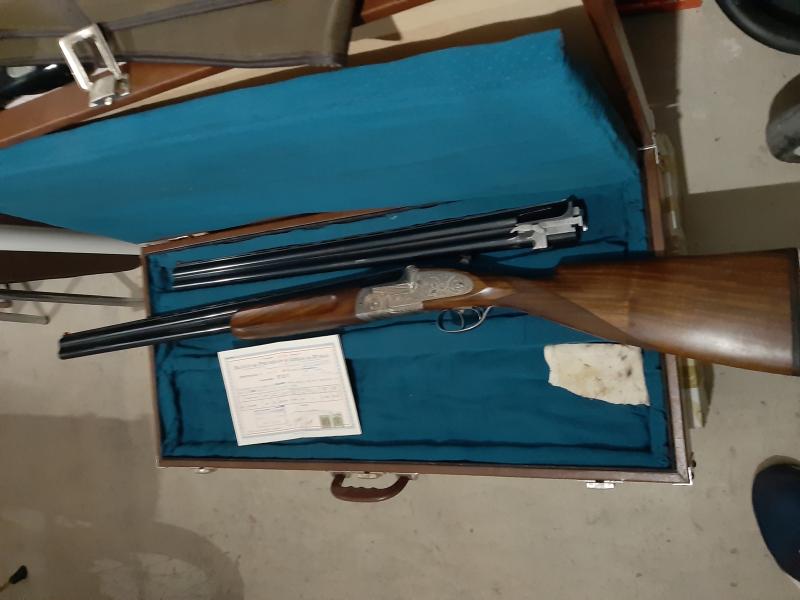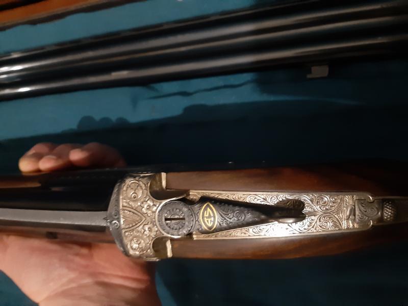 Tiene doble disparador, pletinas enteras grabadas a mano, expulsora y culata cuello cisne.