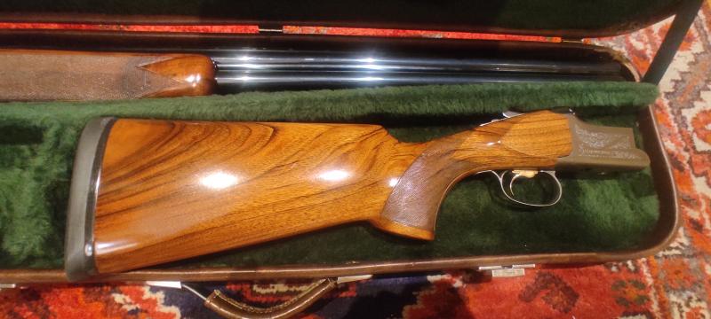 Escopeta de diestro pura de foso por choques, y madera trap. Pistolet con moña. Idéntica a una 525 pero con los cañones de antes