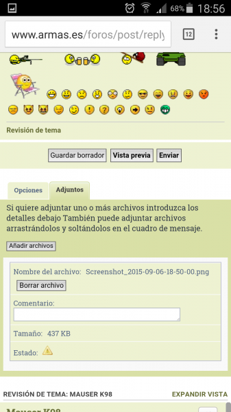 Cuando acabes de escribir tu respuesta en la parte inferior de la página mas abajo de “ vista previa” y “enviar “ veras dos pestañas una es OPCIONES y la otra ADJUNTOS , pinchas en ADJUNTOS a continuación pinchas en añadir ARCHIVOS, buscas la foto en tu PC la subes y a continuación le das a ENVIAR