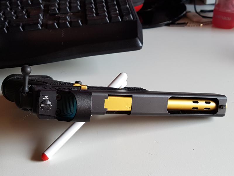 tiene adaptado la rabera, el mawel y se le hizo un picado de la empuñadura para mejor agarre,tiene cambiado todos los muelles para rebajar el peso, el cañon se perforo y se nitruro en la armeria casa puntos para consegir una espectacular mejora de la reelevacion y se le añadio un sistema para el visor del punto rojo que permite un encare muy rapido.
