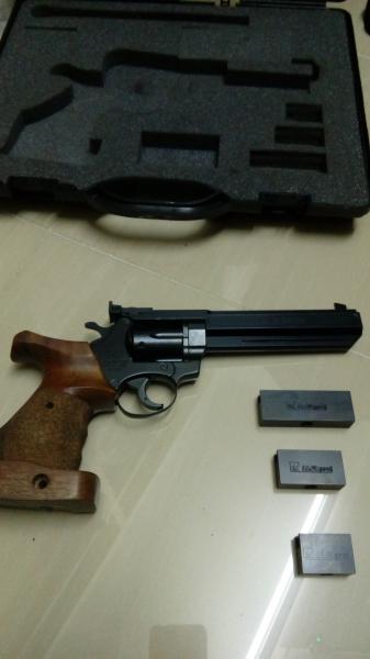 Magnifico revolver Alfa de seis disparos y seis pulgadas con guia en el lomo del cañon para elementos de punteria adicionales, cachas anatomicas y regulables, tres contrapesos diferentes, maletin original, y alzas de tiro tipo walther.