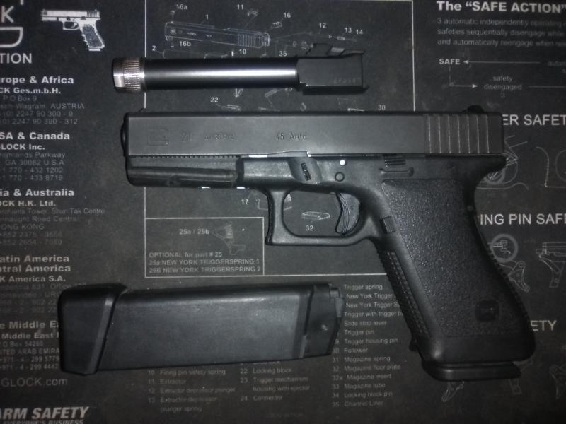 Glock 21 en 45 ACP, con otro cañon adicional ,mas largo y roscado.300€