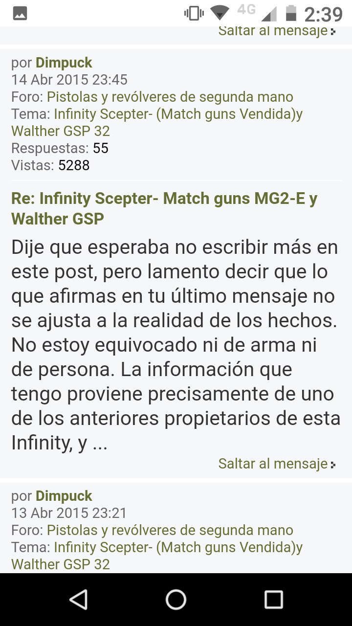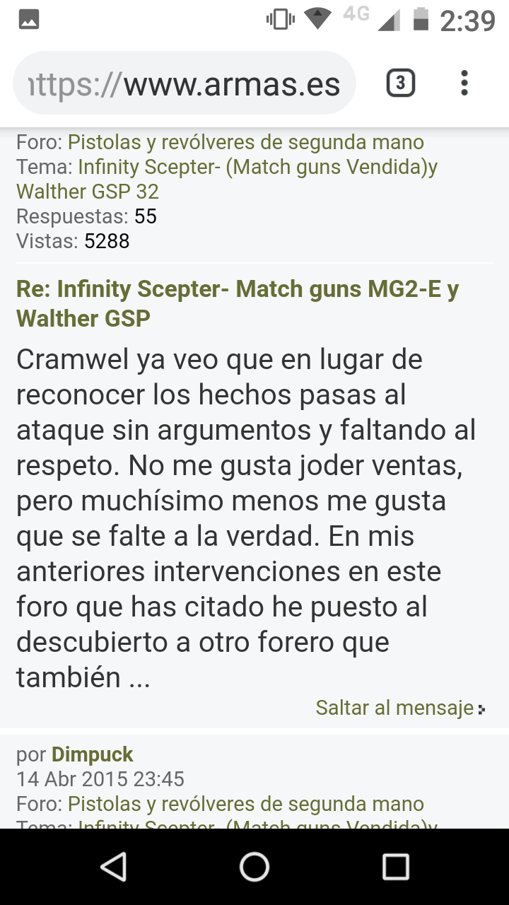 Yo personalmente conozco al forero Dimpuck desde hace muchos años. Más d uno se llevaria una gran sorpresa d saber quien es y seguro q se arrepenteria d dudar d el o d hablar mal d el . Es un grandisimo entendido d las infinity. Yo no voy a decir aqui las infinity q el ha tenido tanto del modelo scepter como de las tipo 2011 para Ipsc. Eso deberia decirlo el mismo. Pero conociendole como le conozco no creo q lo haga, ya q nunca ha presumido ni d quien es, ni d las armas q ha tenido, ni d su palmares deportivo. A muchos foreros siempre nos ha ayudado con sus intervenciones y muchos no han sido engañados o estafados gracias a el. En todas sus intervenciones siempre lo ha hecho con toda la verdad descubriendo irregularidades d anuncios d ventas d armas d este foro. Por eso tenemos mucho q agradecerle. Mas d un vendedor q se ha visto descubierto por Dimpuck con irregularidades se ha quejado a los administradores del foro buscando su ayuda, pero no les han ayudado porque quienes lo habian hecho mal habian sido ellos y no Dimpuck. Seguro q los moderadores d este foro nunca han apreciado q sea un revientaventas y seguro q han agradecido sus intervenciones y sus aportaciones, ya q cualquier ayuda d cualquier forero siempre es bienvenida. Yo desde aqui le envio un abrazo y gracias x todo. Y por supuesto q la infinity scepter es un gran arma, pero tambien creo q el vendedor no la anunciado como exigen ciertas normas escritas y no escritas. Es mi modesta opinion. Aun asi le deseo mucha suerte en la venta y seguro q si la pistola esta bien d todo su nuevo propietario la disfrutara mucho.