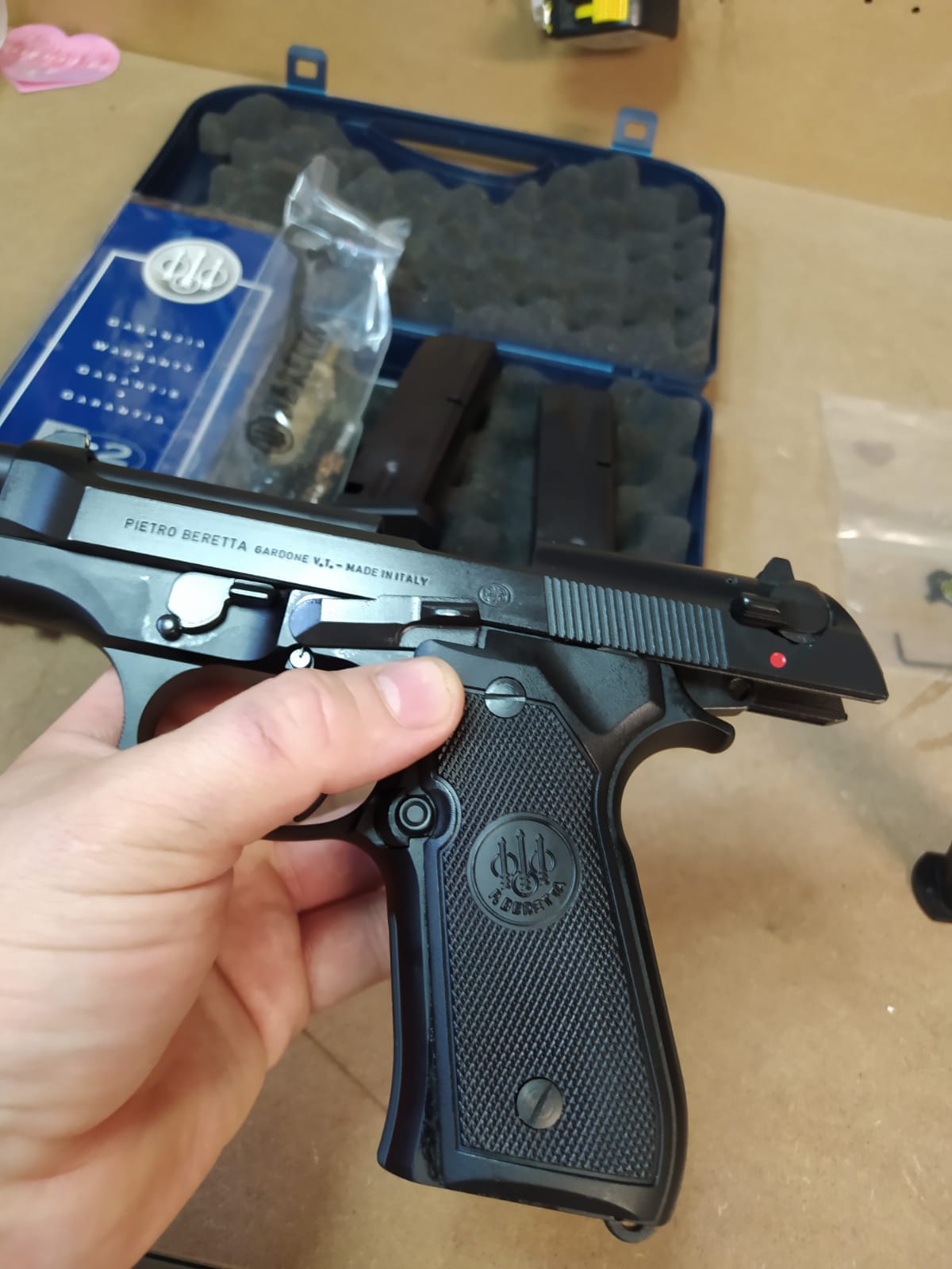 Tiene mas de 200€ en mejoras que le puse haces 4 meses , mira micrométrica en la corredera de 9mm , (en la del 22 viene de serie), kit de reducir peso al gatillo (consta de martillo aligerado muelle de martillo ,gatillo, biela que sujeta el martillo y biela que conecta el gatillo con sus muelles, entrego todas las piezas originales, reten de cargador sobre dimensionado(entrego original) , muelle de 9 libras y varilla de acero de recuperar carro , la que viene de serie es de plástico y el muelle muy duro (entrego los originales), cachas de goma entrego las originales.