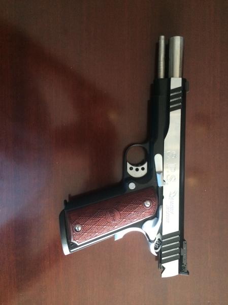 - Empuñadura con grafilado frontal, y cachas de madera, gatillo largo curvado, seguro ambi. extendido inox.