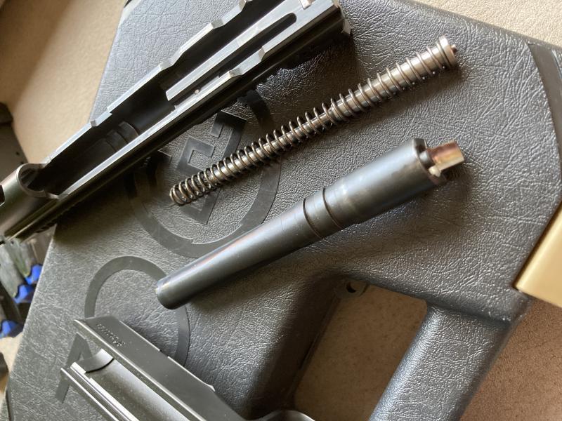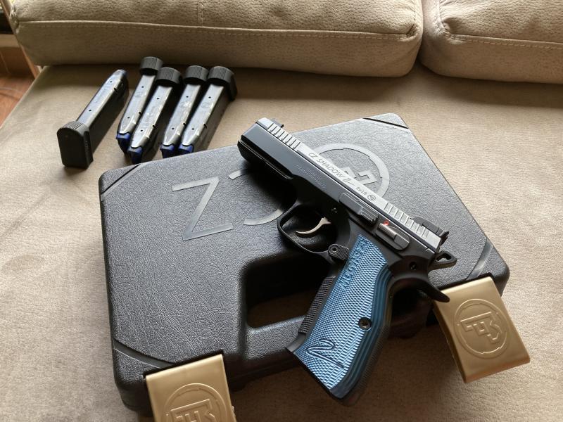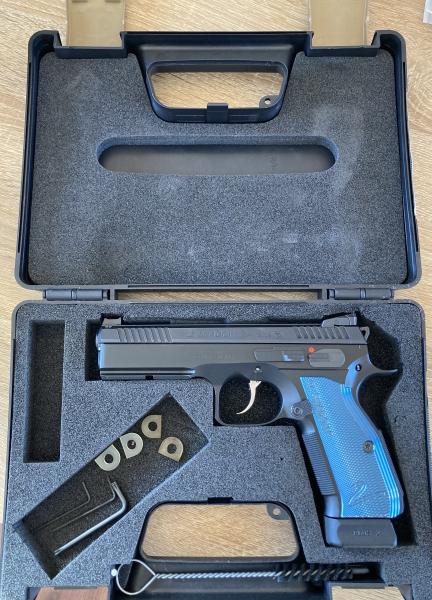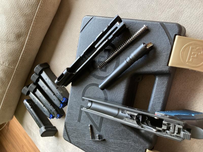 Pistola , cinco cargadores , 3 portacargadores double alpha, funda de polimero, aguja percutora mas larga, retenida corredera extra y muelles de repuesto.