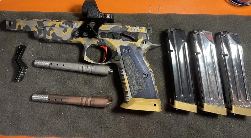 Se vende CZ czechmate del 9x19, pintada en cerakote camuflaje urban gold en armeria casapuntos ,con 3 cañones, 1 nitrurado en color bronce, 1 nuevo, 3 cargadores de 20 con tapas de latón m-arms, gatillo metálico, seguro sobredimensionado grande eemantech ,montura y pedal alexipsc y visor Trijicon SRO 5 Moas , precio 3750, sin visor 3000