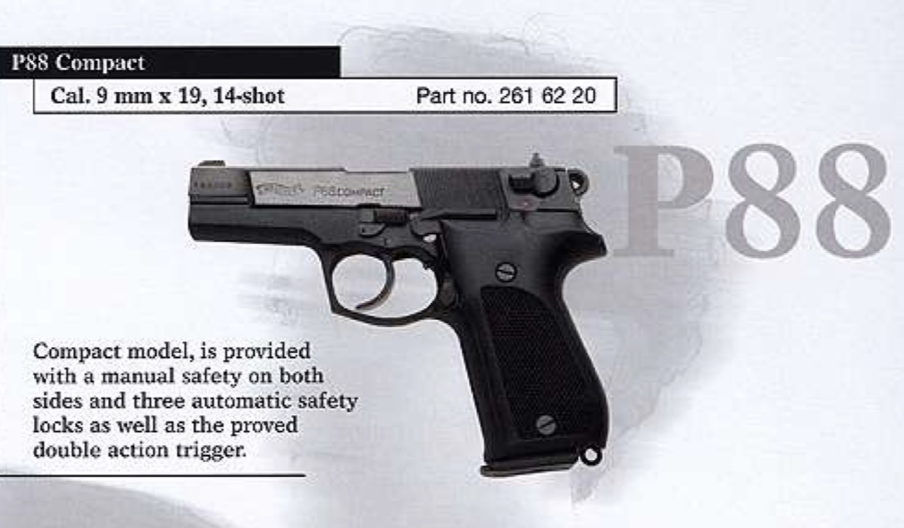 Fabricada por Walther después de la experiencia de 50 años en armas cortas, después de este modelo pasó a fabricar pistolas con base de polímero más comerciales y baratas. La Walther P88C se dejó de fabricar por su alto coste. Un arma muy fiable y precisa, cierre SIG mejorado por Walther , la precisión le viene dada por la calidad y el ajuste de corredera armazón que es completo, de extremo a extremo, tiene tigestop regulable. Su estado nueva, procede de colección. Se vende por cupo lleno, si no se vende se entregará a una armería para su venta.