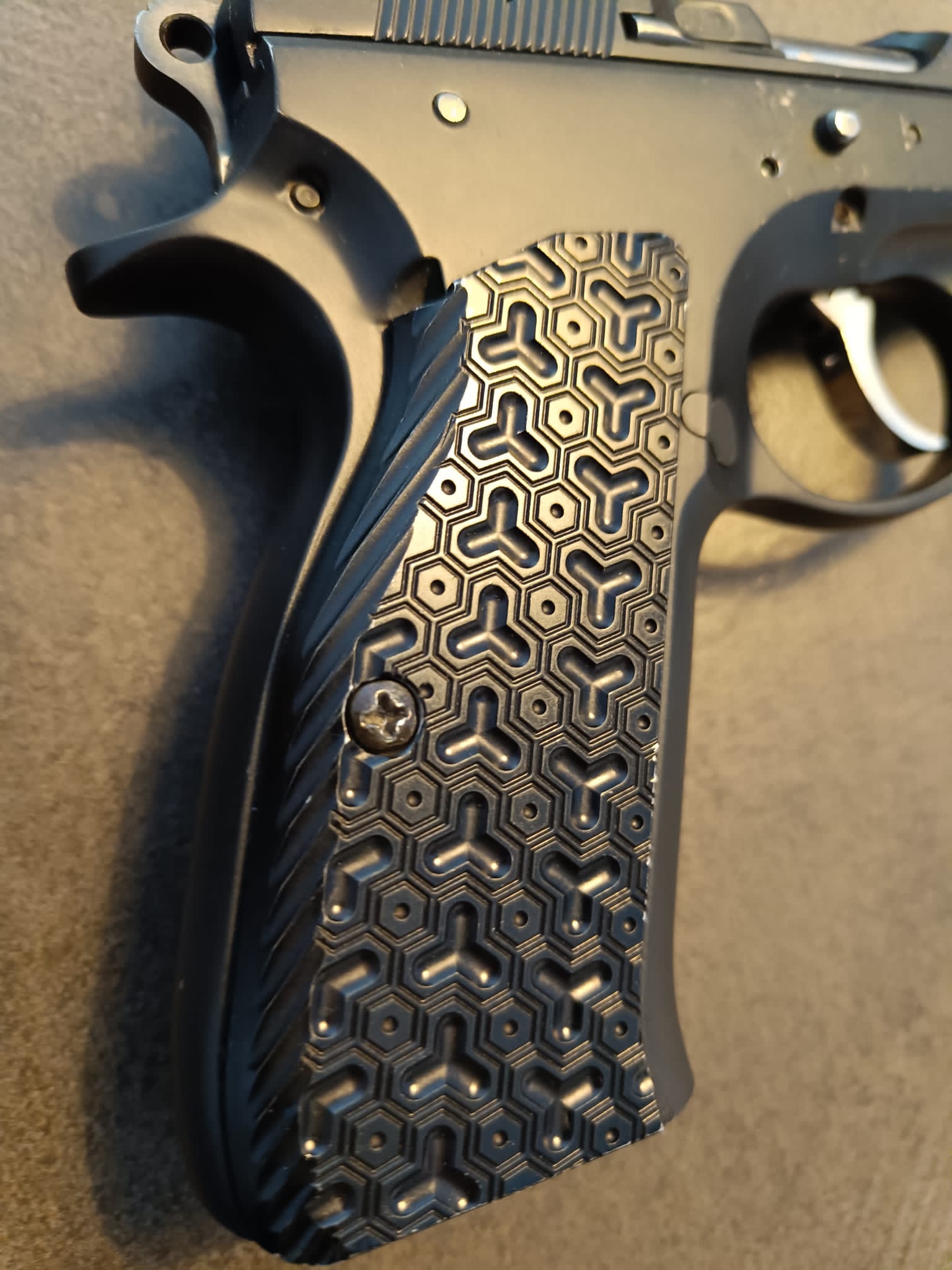 Está preparada para IPSC pero tiene poco huso. Retenida del cargador de CZ Shadow, más grande y cómoda.