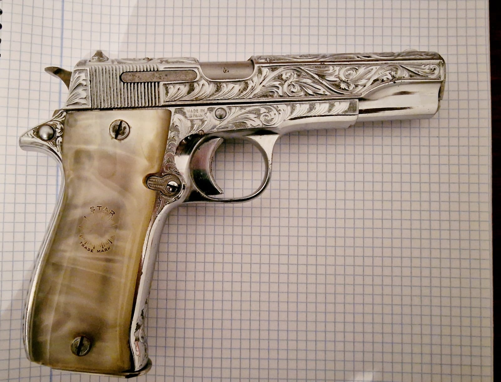 Vendo pistola de colección burilada con incrustaciones de plata, fue un arma fabricada por encargo a Bonifacio Echeverría para el mérito militar, con las iniciales en oro de la persona a quien perteneció, cachas de Nácar, caja, baqueta, libro y dos cargadores no se usó pero está totalmente funcional, lo mejor guiada en F es una pieza única la cual no es barata, quien de verdad la valore que se ponga en contacto conmigo escucho oferta razonable, nada de mareantes ES UNA PIEZA ÚNICA EN ESPAÑA LA CUAL TIENE UN VALOR!!! Tlfn 623569791